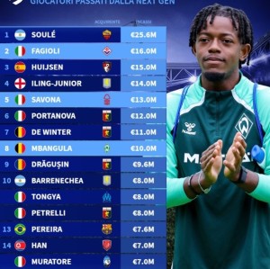 尤文新生代卖人榜:苏莱2560万欧去罗马居首,法乔利第2赫伊森第3