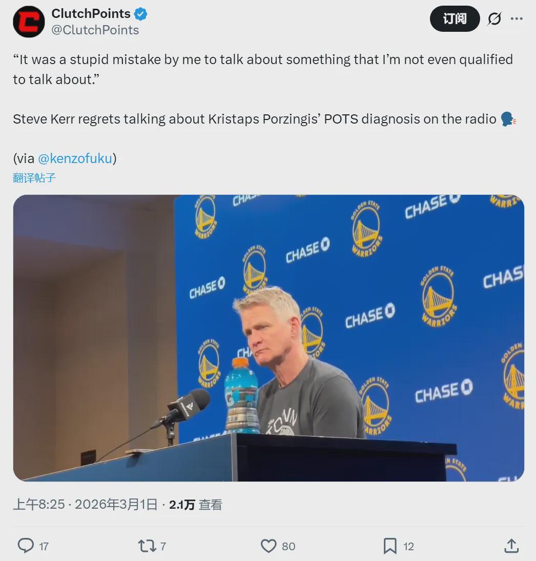 勇士主帅科尔在一档电台节目中回应:自己跟老鹰总经理Onsi Saleh通过电话。Onsi Saleh告诉科尔,波尔津吉斯身患的并非POTS,那是外界的错误信息,波尔津吉斯确诊的是其他怪病。Onsi Saleh曾是勇士副总裁,跟科尔关系密切。